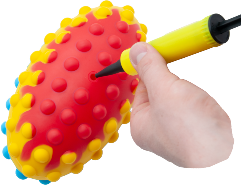 Der Pop it Ball kann einfach mit der mitgelieferten Pumpe problemlos wieder aufgepumpt werden. Je stärker der Druck, desto besser die Flugbahn.